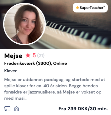 Via Musikundervisning.dk har jeg fundet den underviser, som passer præcist til mig. Altid effektiv og venlig respons når jeg har behov for bistand. Bl.a. var jeg ikke opmærksom på, at der var udløb på klippekort jfr. handelsbetingelserne, men her viste Musikundervisning.dk sig yderst imødekommende og fleksible.